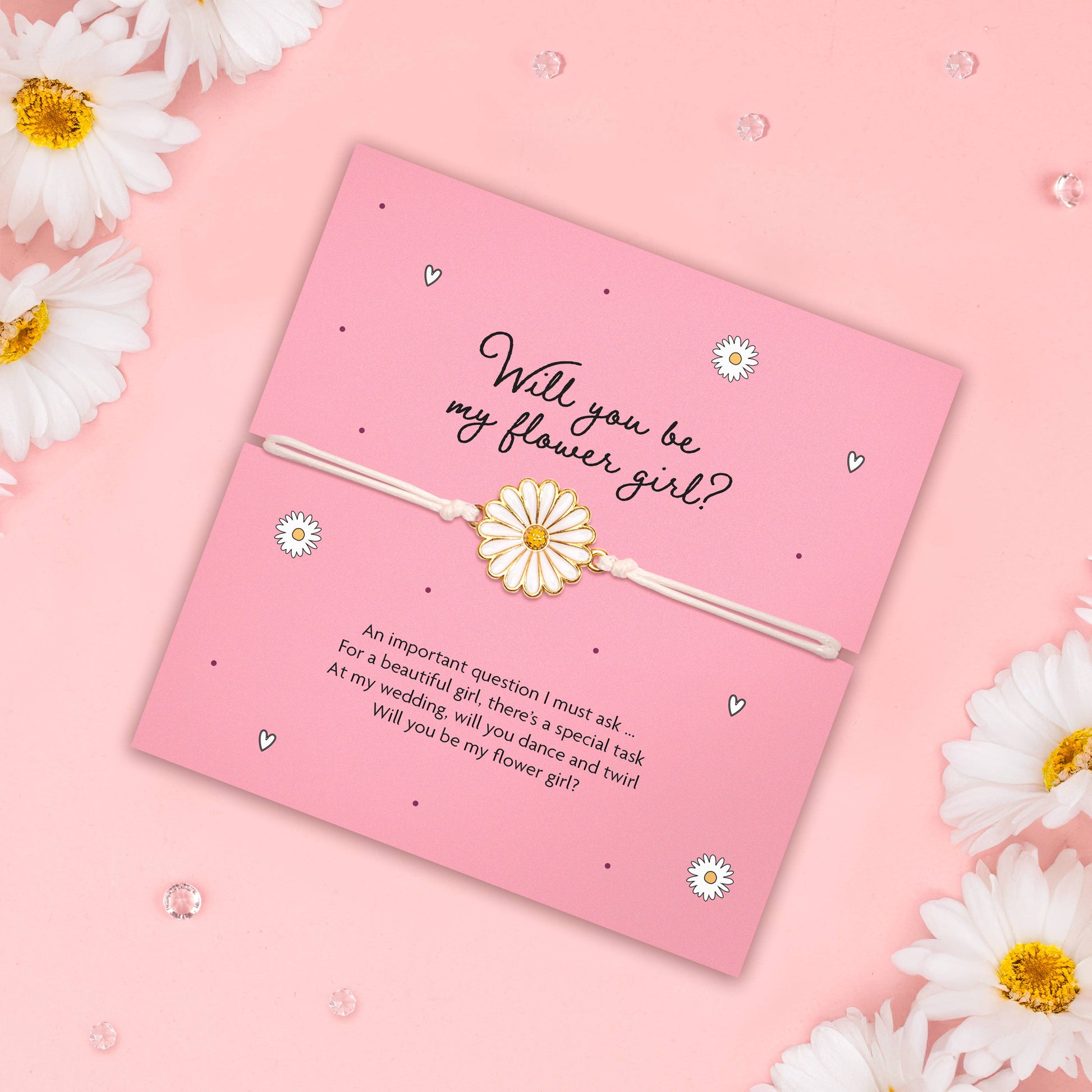 An important question I must ask … For a beautiful girl, there’s a special task At my wedding, will you dance and twirl Will you be my flower girl? Make your flower girl feel extra special with our adorable "Will you be my flower girl?" bracelet. Featuring a beautiful daisy charm on a soft white adjustable cord, this bracelet is a perfect way to ask that important question with a sweet, personal touch. Children should be supervised at all times whilst wearing this bracelet, not suitable for children under the age of 3 due to small parts.