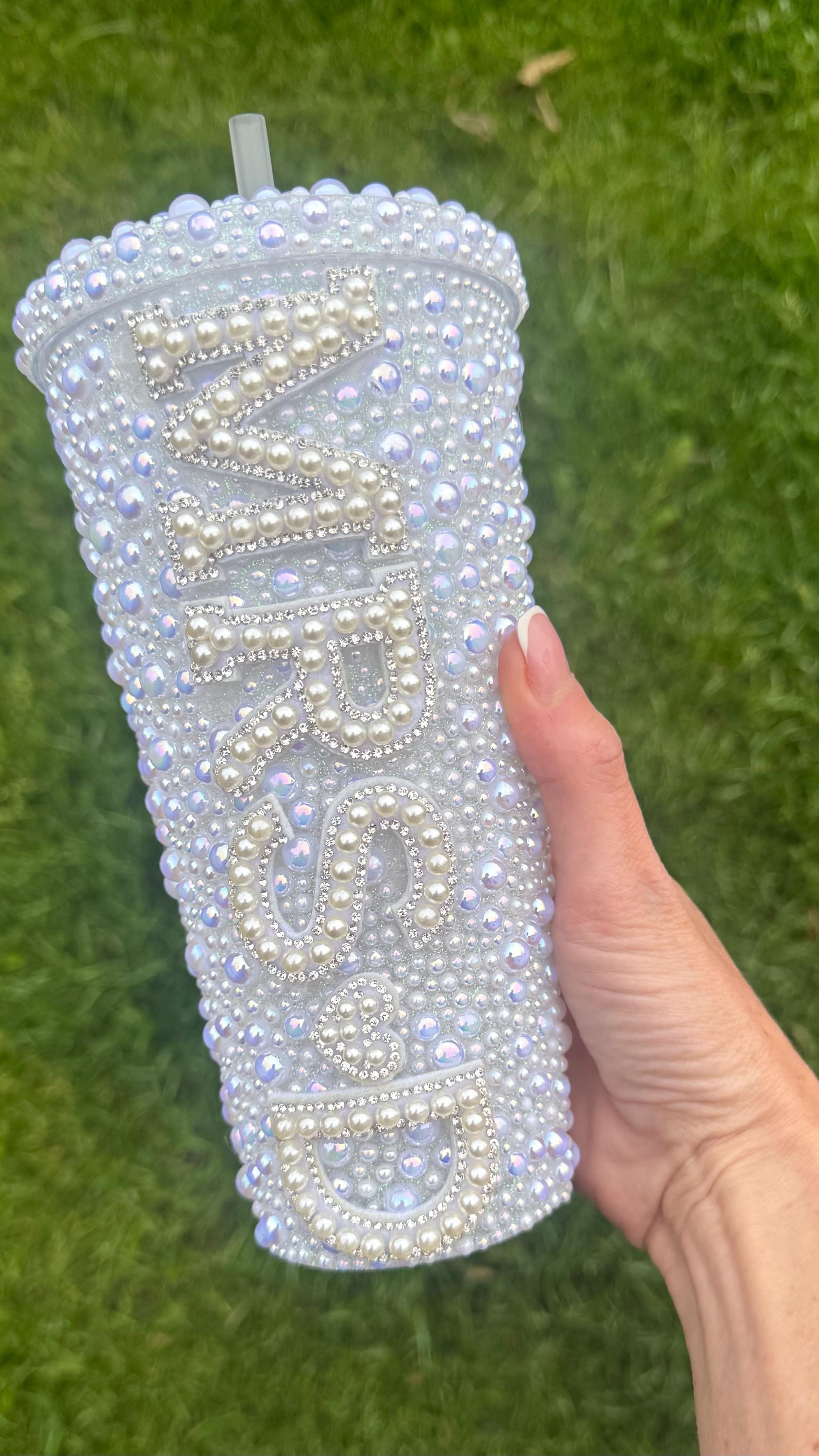 Elevate your hen party or wedding celebration with this reusable trending cold cup adorned with pearls and an embellished "bride." The dazzling glitter adds a touch of magic to your drink, while the sparkling MRS and your chosen initial embellishment adds elegance and charm. Add some bling to your drink